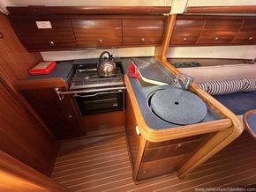 L-shaped galley with gas cooker, fridge, sink and storage