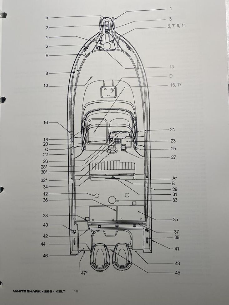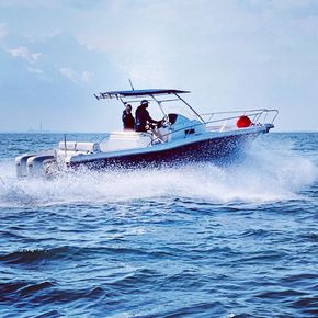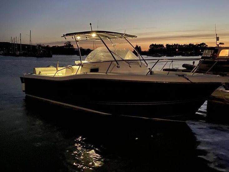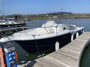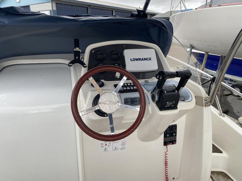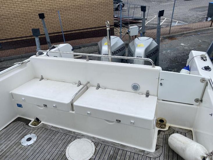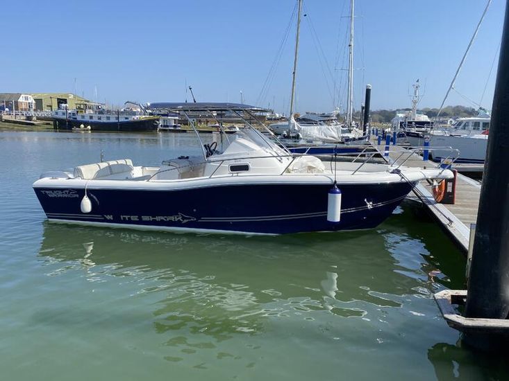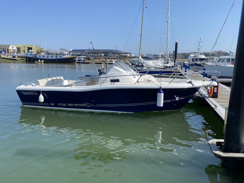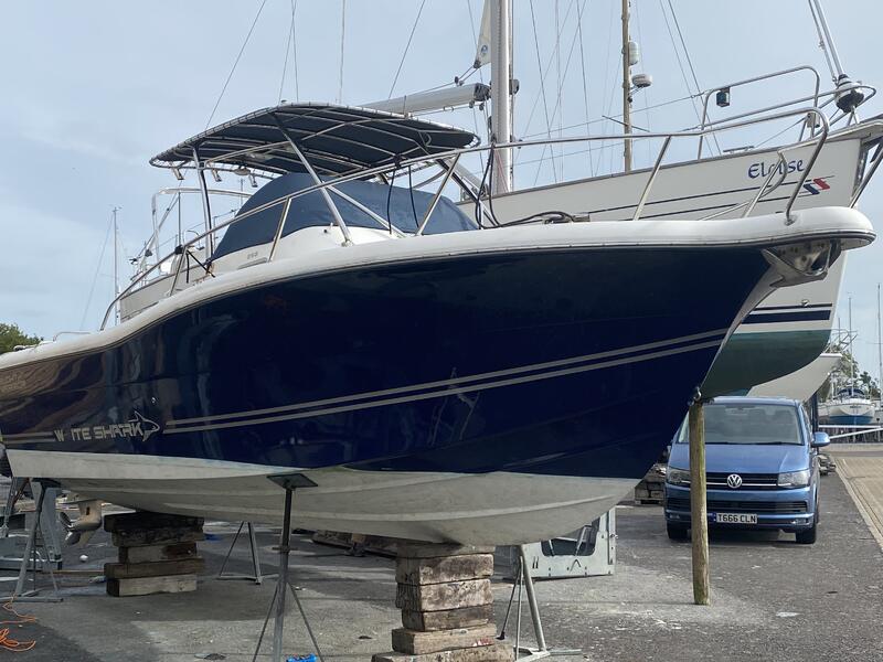 White Shark 268 with legendary White Shark offshore sea keeping performance this CE design category B cruiser will cover sea passages with speed, comfort and safety in all conditions. Twin Honda 225hp VTEC 4 stroke outboards with stainless steel props give a top speed of 44 knots and economical cruising at 27 knots. Shore power and battery charge and maintenance. There is a high standard of fit out with 4 berths in one cabin, separate heads with electric flush, hand basin and shower, galley with sink, 49lt fridge, portable single gas stove, table and seating that converts to double bed. Clarion stereo with speakers in cabin and cockpit, VHF radio, Lowrance combined fish finder and chart plotter. The cockpit is spacious with rear seating and helm leaning post with fold down seat and stowable cockpit table. Deck and canopy lighting, Teak decks, deck wash shower, walk through door to boarding ladder, ski post, T top over helm position. Walk round side decks lead to a huge forward sun deck with cushions. There is an electric anchor winch with stainless anchor and chain. There is an overall winter cover included. 440 litre fuel tank and 80 litre fresh water. More pictures available on request